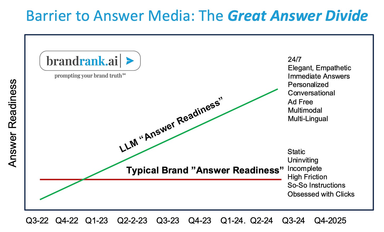 Brands today must understand how to optimize their own "Answer Media," and most are either failing or don't yet understand what's happening. For instance, most brands struggle to answer even the most basic questions on their owned media assets like websites, leaving gaps—what we call the Answer Divide—where misinformation or competitor content fills the void.